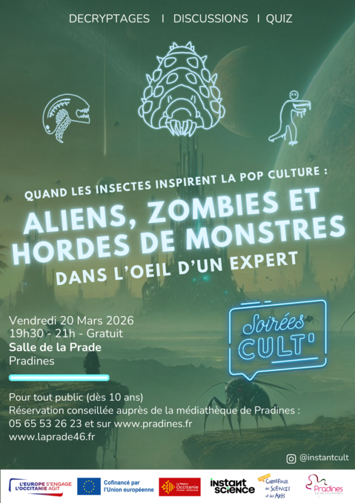 Vendredi 20 mars à 19h30 on vous propose une soirée incroyable où Mathieu Lihoreau (chercheur au CNRS, spécialisé dans l’étude de l’intelligence des insectes) décryptera des scènes de cinéma où les insectes inspirent la pop culture ! Vous aviez participé à nos soirées cult’ Harry Potter ou encore Jurassic Park ?! Alors vous connaissez le concept : quiz, blind-test, lots à gagner, pop corn, tout est là pour vous faire passer une soirée décontractée et conviviale où les sciences se cachent toujours la où on ne les attends pas 😉 Lors de cette soirée notre expert décortiquera quelques scènes où aliens, zombies et hordes de monstres du cinéma se sont inspirés largement d’insectes que vous connaissez ou allez découvrir ! La soirée est conçue pour TOUS, n’ayez pas peur du mot aliens ou zombies 😉 ce n’est pas une soirée halloween pour effrayer, mais bien une soirée à vivre en famille (promis dès 10 ans c’est permis !)